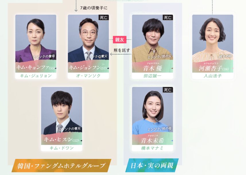 日本では「青木照」として生きていた過去があり、二つの名前・二つの文化の間で揺れる主人公の葛藤が相関図の核となっています。