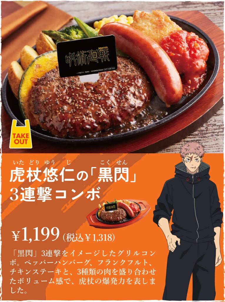虎杖の「黒閃3連撃コン」は、ペッパーハンバーグ・フランクフルト・チキンステーキの3種を盛り合わせたグリルコンボです。