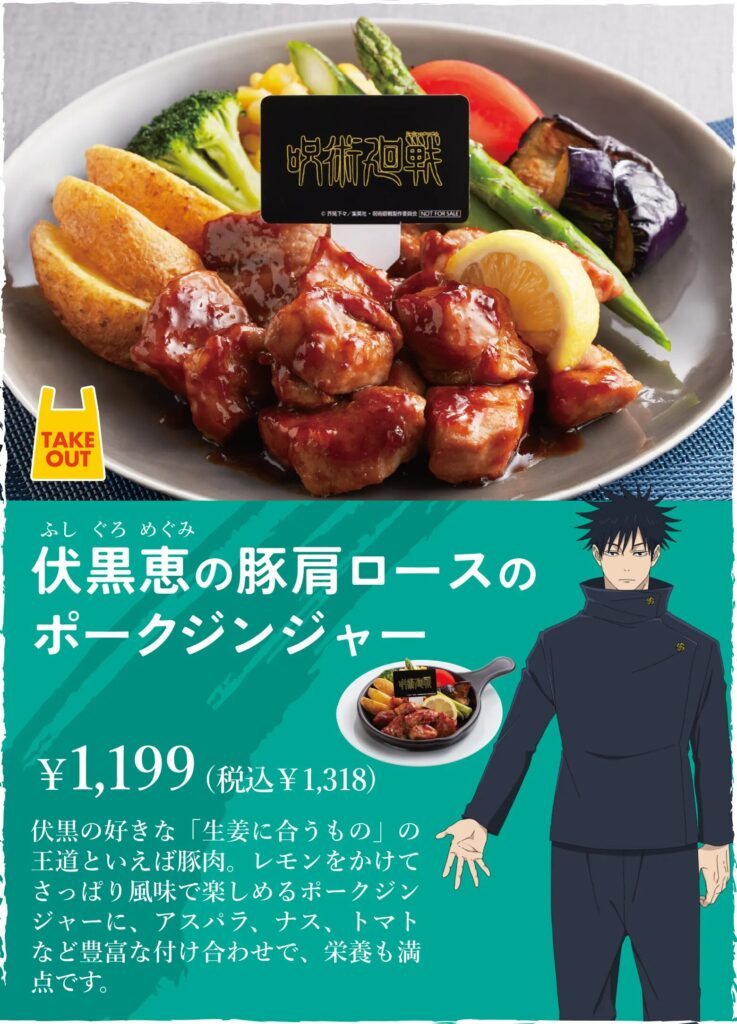 伏黒の「ポークジンジャー」は、伏黒が好きな「生姜に合うもの」をイメージしたレモンさっぱり仕立ての一品です。