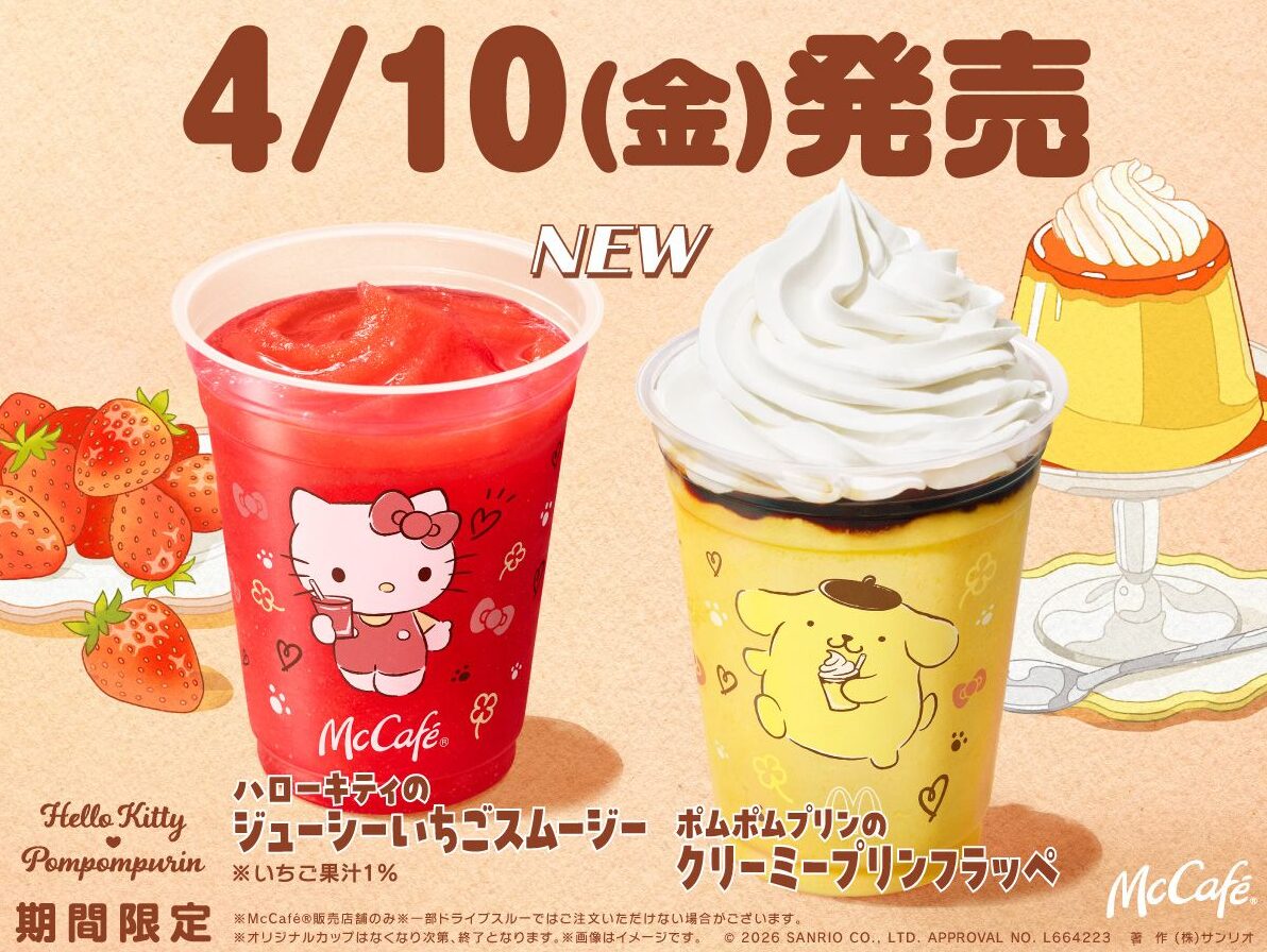 マックカフェ×ハローキティ&ポムポムプリンのコラボドリンクは、2026年4月10日(金)から全国のMcCafé提供店舗で期間限定販売されます。