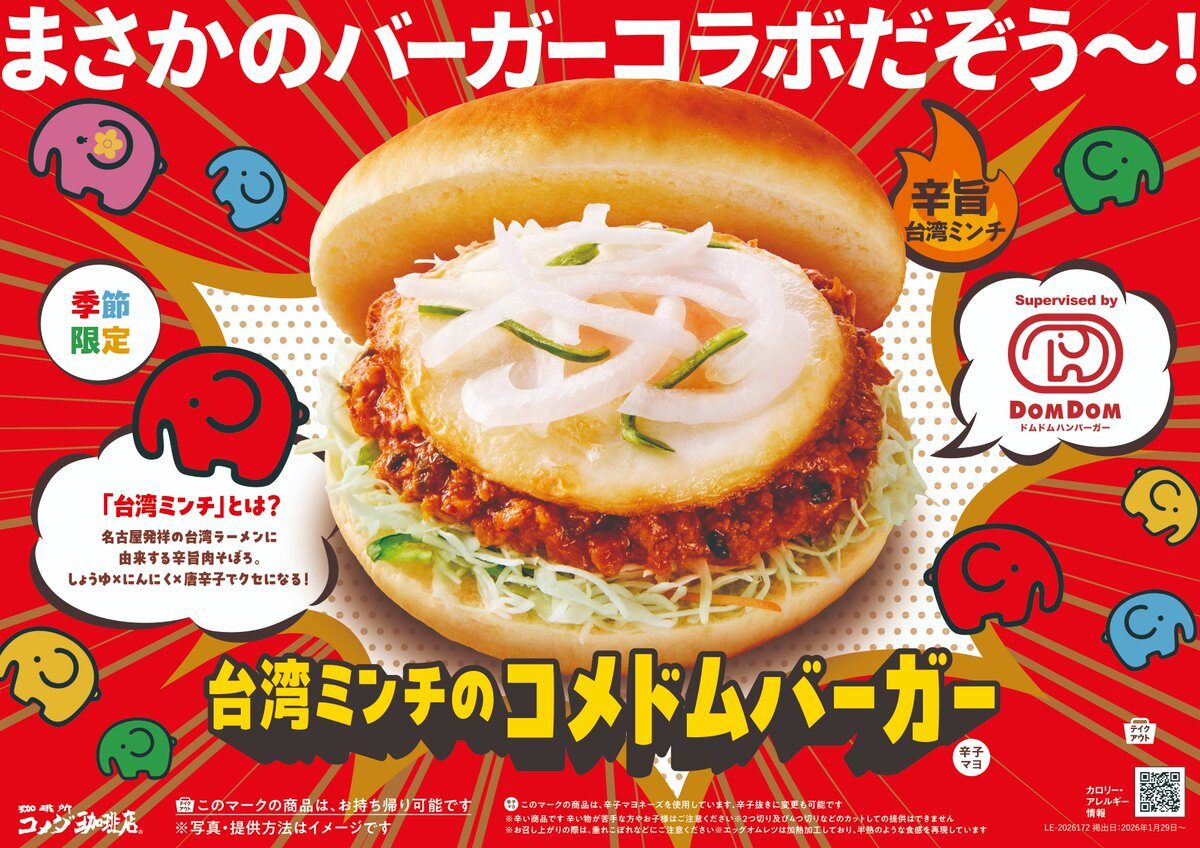 最新のコメダコラボとしては、ドムドムハンバーガーとのコラボ第2弾が発表されており、「台湾ミンチのコメドムバーガー」は2026年1月29日~3月上旬予定で展開(なくなり次第終了)とされています。