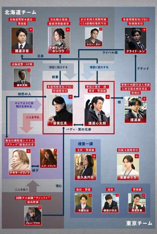 - 護道 泉(永瀬廉):警察庁 内閣官房人事課 人材交流企画室室長。FBI特別捜査官クライド・ユンのアテンド役。